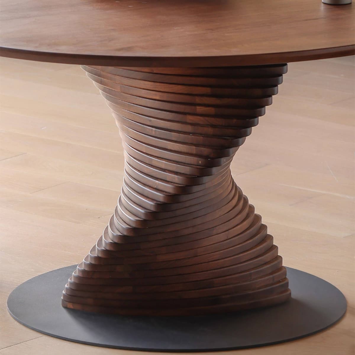 The soul of the Helios lies in its base. Moving away from static, traditional columns, our artisans have employed parametric design principals to create a helical stacked pedestal. Layer upon layer of solid walnut rotates incrementally, creating a fluid, twisting form that plays with light and shadow. This architectural marvel provides robust stability—anchoring the table with a low center of gravity—while visually lifting the massive solid wood top, imparting a sense of lightness and dynamic energy to your room.